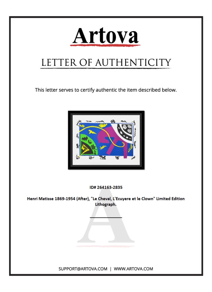 "Le Cheval, L'Ecuyere et le Clown" is a limited edition lithograph by Henri Matisse (1869-1954). This piece comes from an edition of 200 authorized by the Matisse Estate; the edition number is not on the piece itself but on the certificate. This piece comes custom framed. Includes Certificate of Authenticity. Measures approx. 37" x 29" (frame), 31" x 23" (image).