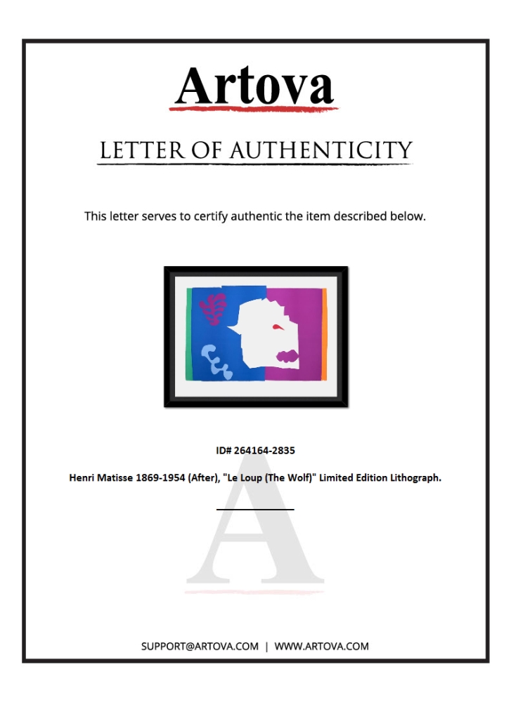 "Le Loup (The Wolf)" is a limited edition lithograph by Henri Matisse (1869-1954). This piece comes from an edition of 200 authorized by the Matisse Estate; the edition number is not on the piece itself but on the certificate. This piece comes custom framed. Includes Certificate of Authenticity. Measures approx. 37" x 29" (frame), 31" x 23" (image).
