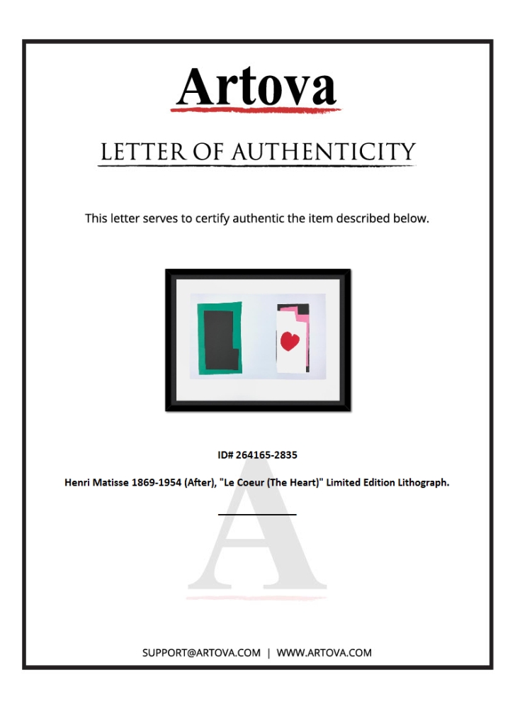 "Le Coeur (The Heart)" LE 37x29 Custom Framed Lithograph by Henri Matisse (Artova)