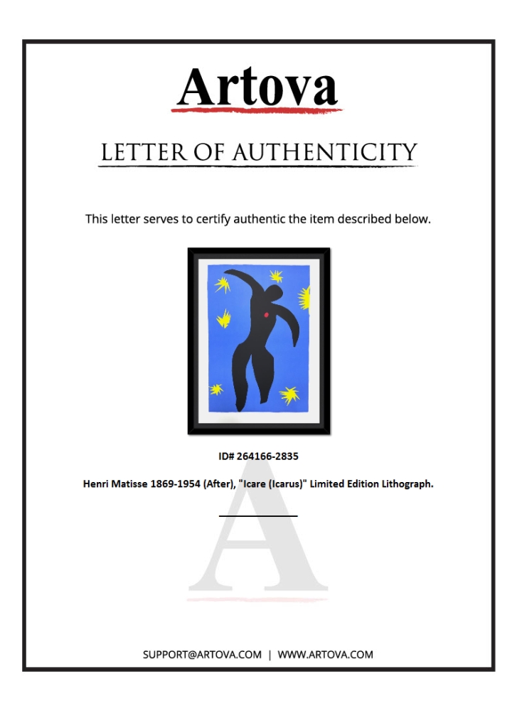 "Icare (Icarus)" is a limited edition lithograph by Henri Matisse (1869-1954). This piece comes from an edition of 200 authorized by the Matisse Estate; the edition number is not on the piece itself but on the certificate. This piece comes custom framed. Includes Certificate of Authenticity. Measures approx. 29" x 37" (frame), 23" x 31" (image).