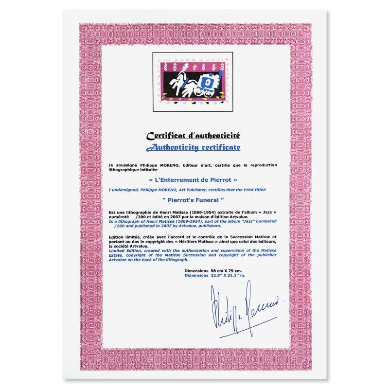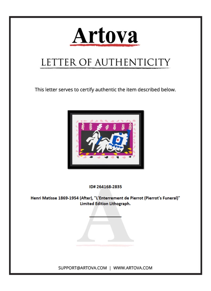 "L'Enterrement de Pierrot (Pierrot's Funeral)" is a limited edition lithograph by Henri Matisse (1869-1954). This piece comes from an edition of 200 authorized by the Matisse Estate; the edition number is not on the piece itself but on the certificate. This piece comes custom framed. Includes Certificate of Authenticity. Measures approx. 37" x 29" (frame), 31" x 23" (image).