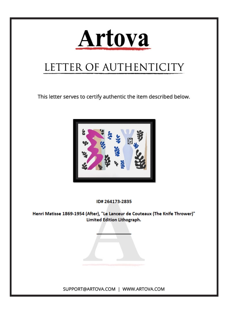 "Le Lanceur de Couteaux (The Knife Thrower)" is a limited edition lithograph by Henri Matisse (1869-1954). This piece comes from an edition of 200 authorized by the Matisse Estate; the edition number is not on the piece itself but on the certificate. This piece comes custom framed. Includes Certificate of Authenticity. Measures approx. 37" x 29" (frame), 31" x 23" (image).