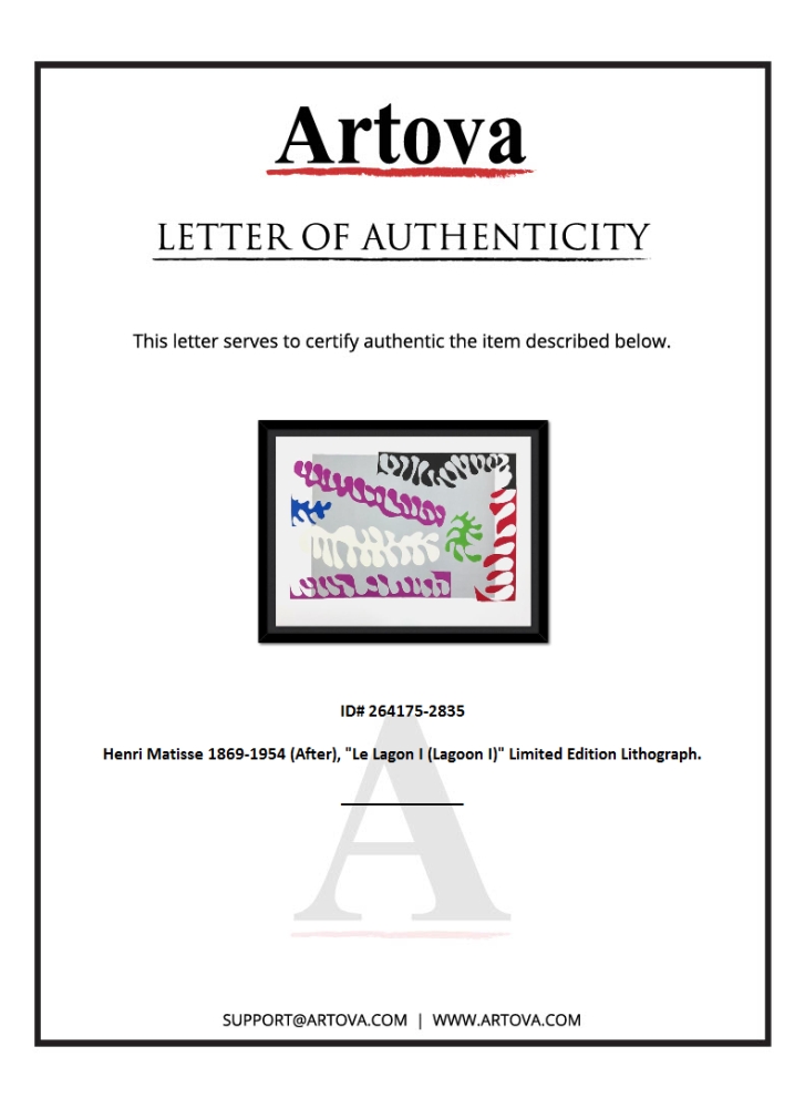 "Le Lagon I (Lagoon I)" is a limited edition lithograph by Henri Matisse (1869-1954). This piece comes from an edition of 200 authorized by the Matisse Estate; the edition number is not on the piece itself but on the certificate. This piece comes custom framed. Includes Certificate of Authenticity. Measures approx. 37" x 29" (frame), 31" x 23" (image).