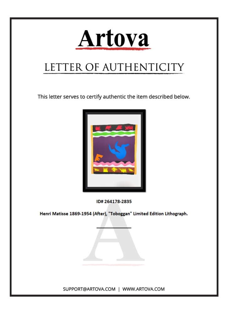 "Toboggan" is a limited edition lithograph by Henri Matisse (1869-1954). This piece comes from an edition of 200 authorized by the Matisse Estate; the edition number is not on the piece itself but on the certificate. This piece comes custom framed. Includes Certificate of Authenticity. Measures approx. 29" x 37" (frame), 23" x 31" (image).