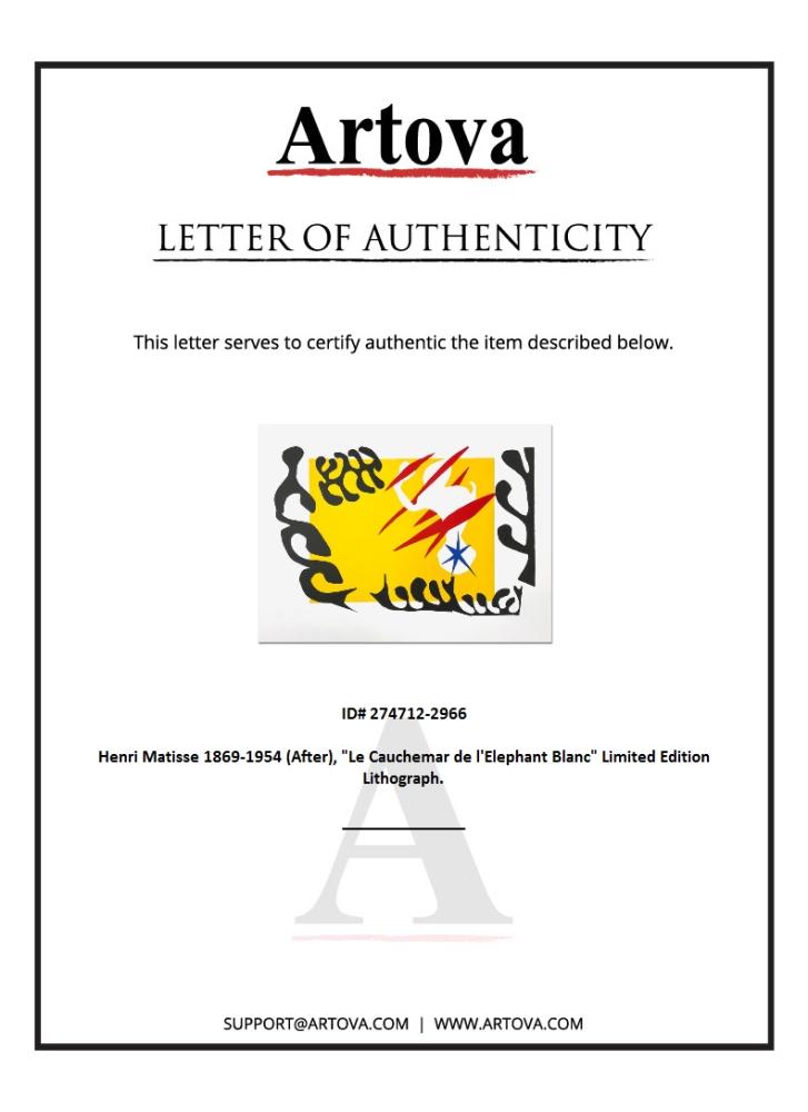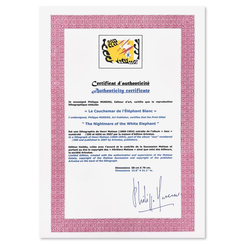 "Le Cauchemar de l'Elephant Blanc" is a limited edition lithograph by Henri Matisse (1869-1954). This piece comes from an edition of 200 authorized by the Matisse Estate; the edition number is not on the piece itself but on the certificate. Includes Certificate of Authenticity. Measures approx. 31" x 23" (image).