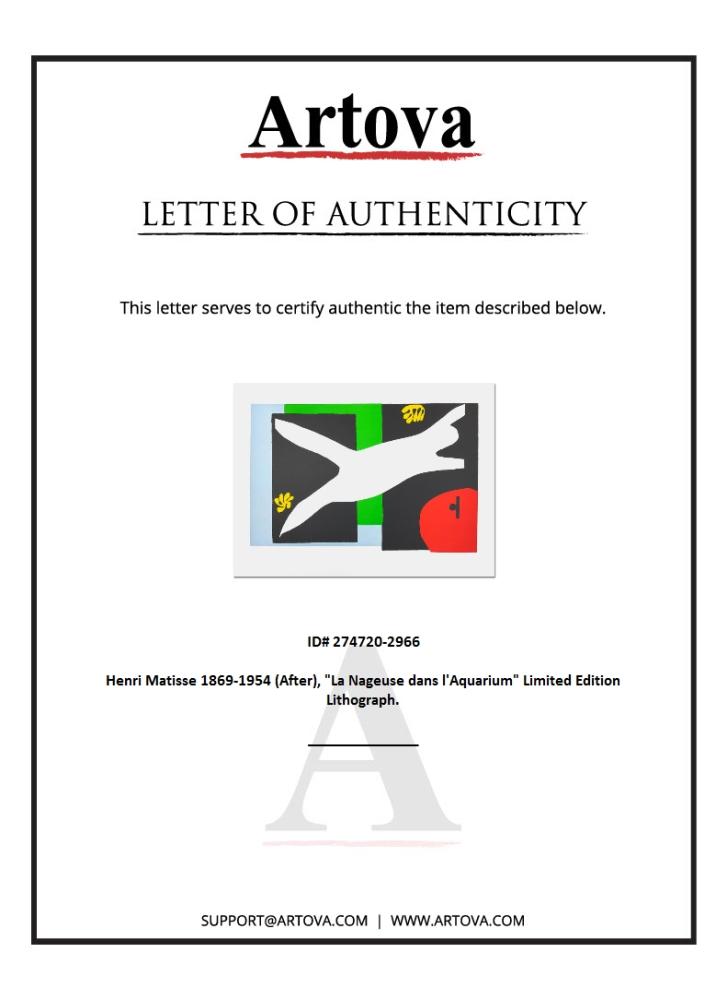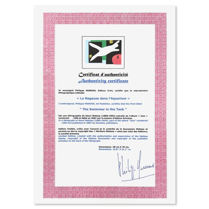 "La Nageuse dans l'Aquarium (The Swimmer in the Tank)" is a limited edition lithograph by Henri Matisse (1869-1954). This piece comes from an edition of 200 authorized by the Matisse Estate; the edition number is not on the piece itself but on the certificate. Includes Certificate of Authenticity. Measures approx. 31" x 23" (image).