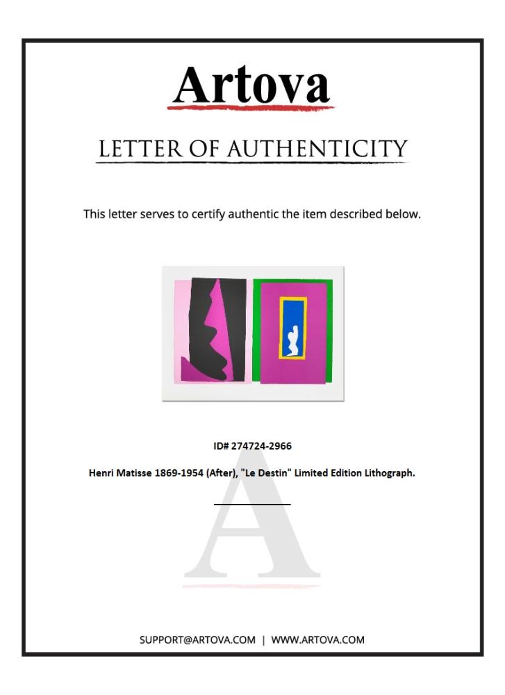 "Le Destin (Destiny)" is a limited edition lithograph by Henri Matisse (1869-1954). This piece comes from an edition of 200 authorized by the Matisse Estate; the edition number is not on the piece itself but on the certificate. Includes Certificate of Authenticity. Measures approx. 31" x 23" (image).