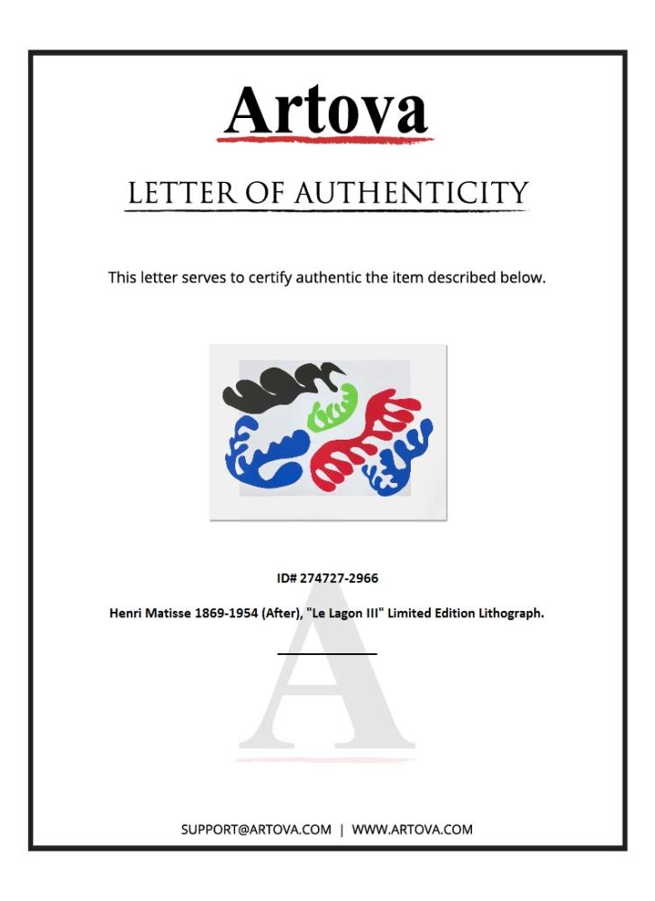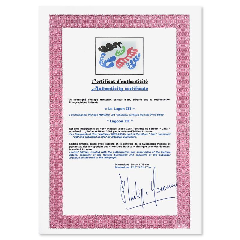 "Le Lagon III (Lagoon III)" is a limited edition lithograph by Henri Matisse (1869-1954). This piece comes from an edition of 200 authorized by the Matisse Estate; the edition number is not on the piece itself but on the certificate. Includes Certificate of Authenticity. Measures approx. 31" x 23" (image).