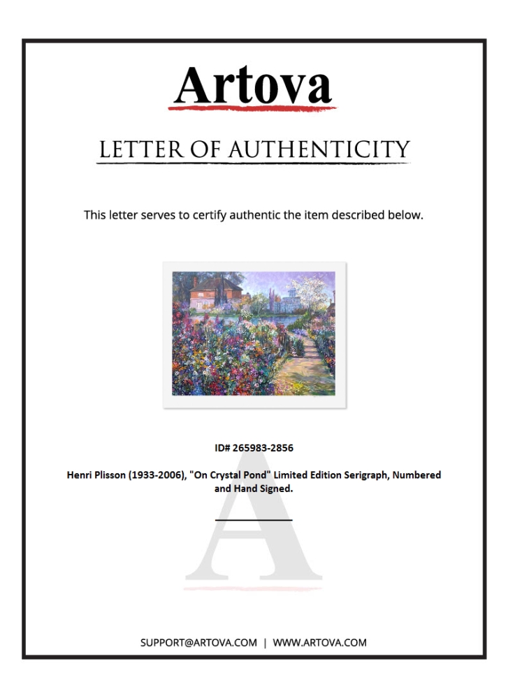 "On Crystal Pond" is a limited edition serigraph on paper by Henri Plisson (1933-2006), numbered and hand signed by the artist. Includes Letter of Authenticity. Measures approx. 36" x 45" (border), 30" x 40" (image).