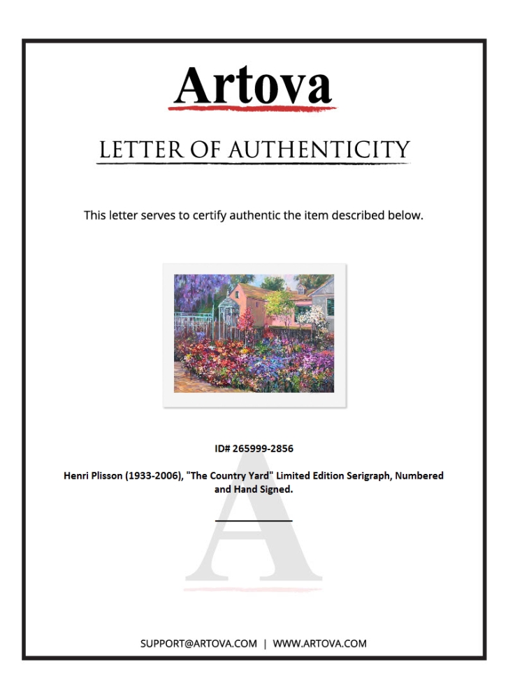 "The Country Yard" is a limited edition serigraph on paper by Henri Plisson (1933-2006), numbered and hand signed by the artist. Includes Letter of Authenticity. Measures approx. 30.5" x 38.5" (border), 25" x 33.5" (image).