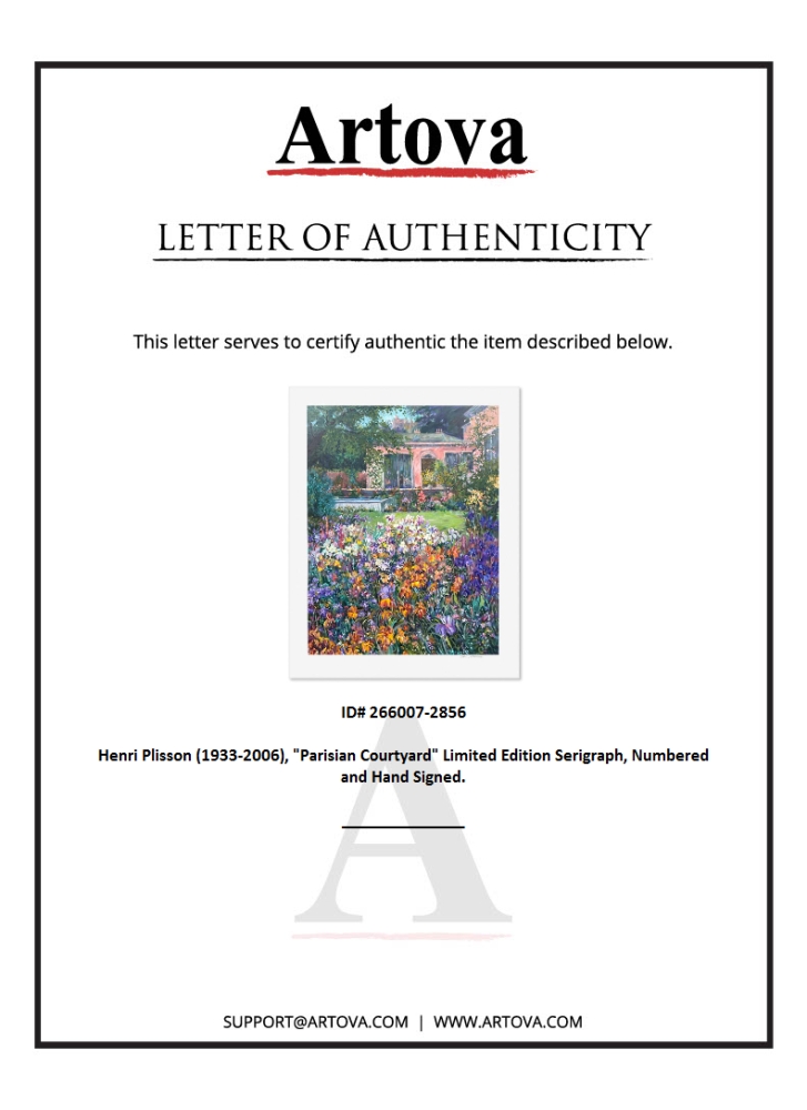 "Parisian Courtyard" is a limited edition serigraph on paper by Henri Plisson (1933-2006), numbered and hand signed by the artist. Includes Letter of Authenticity. Measures approx. 39" x 30" (border), 33.5" x 25" (image).