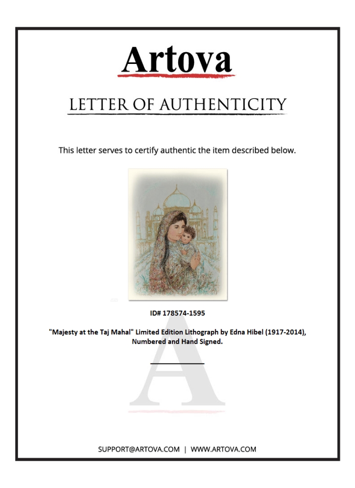 "Majesty at the Taj Mahal" is a limited edition lithograph on rice paper, numbered and hand-signed by Edna Hibel (1917-2014). Includes Certificate of Authenticity! Measures approx. 22" x 30" (with border) 19" x 26.5" (image).