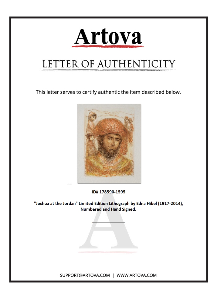 "Joshua at the Jordan" is a limited edition lithograph on paper, numbered and hand-signed by Edna Hibel (1917-2014). Measures approx. 22" x 30" (with border), 17" x 23" (image).