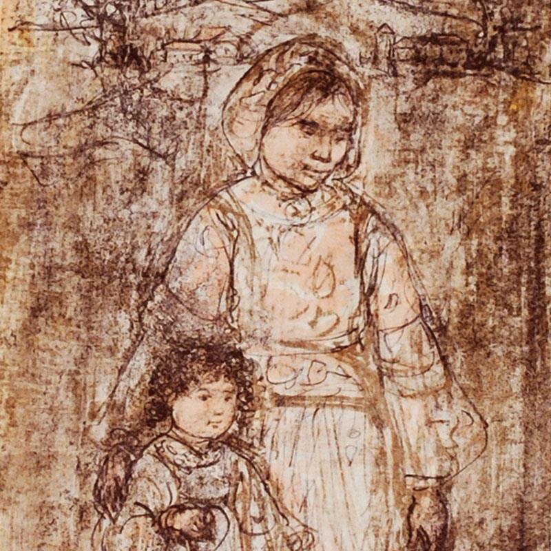 Edna Hibel (1917-2014) grew up in the Boston area and by the young age of 9, she began experimenting with painting in elementary school. Her summers where spent along the shore in Hull, Massachusetts and in Maine learning about watercolor painting. Hibel received her formal artistic training at the Boston Museum School of Fine Arts, from 1935-1939. In 1942, she earned the Sturtevant Traveling Fellowship to Mexico.