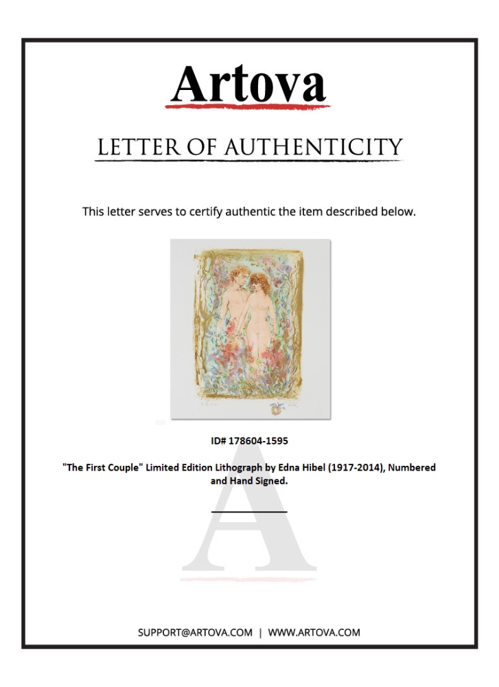 "The First Couple" is a limited edition lithograph on paper, numbered and hand-signed by Edna Hibel (1917-2014). Measures approx. 18" x 22" (with border), 12" x 16" (image).