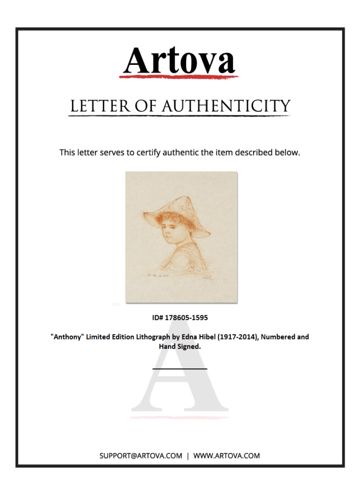 "Anthony" is a limited edition lithograph on paper, numbered and hand signed by Edna Hibel (1917-2014). Includes Certificate of Authenticity! Measures approx. 18" x 22" (with border), 9" x 11" (image).