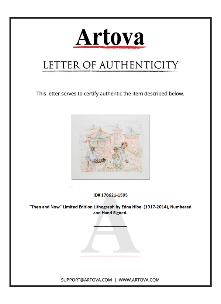 "Then and Now" is a limited edition lithograph on paper, numbered and hand-signed by Edna Hibel (1917-2014). Includes Certificate of Authenticity! Measures approx. 16" x 20" (with border), 20" x 16" (image).