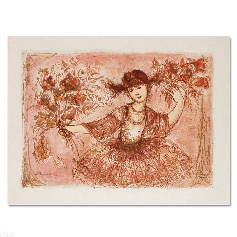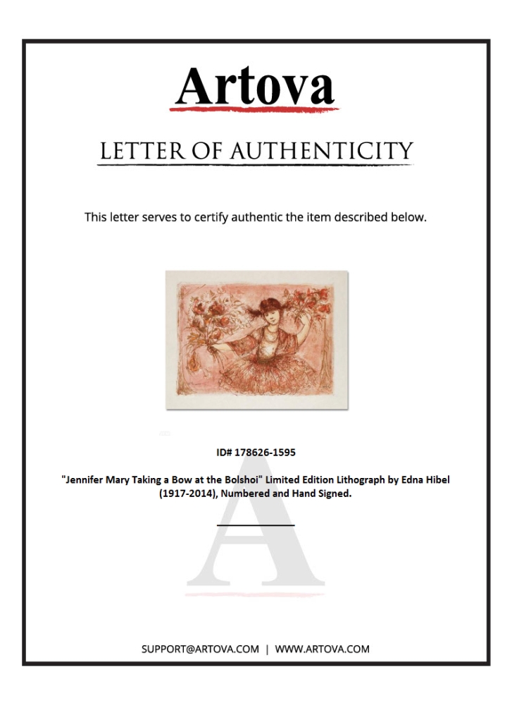 "Jennifer Mary Taking a Bow at the Bolshoi" is a limited edition lithograph on paper, numbered and hand-signed by Edna Hibel (1917-2014). Measures approx. 19" x 25" (with border), 21" x 15" (image).