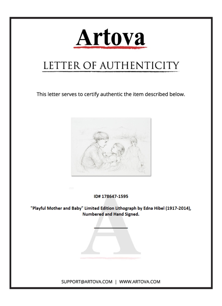 "Playful Mother and Baby" is a limited edition lithograph on paper, numbered and hand signed by Edna Hibel (1917-2014). Includes Certificate of Authenticity! Measures approx. 16" x 11.5" (with border), 16" x 9" (image).