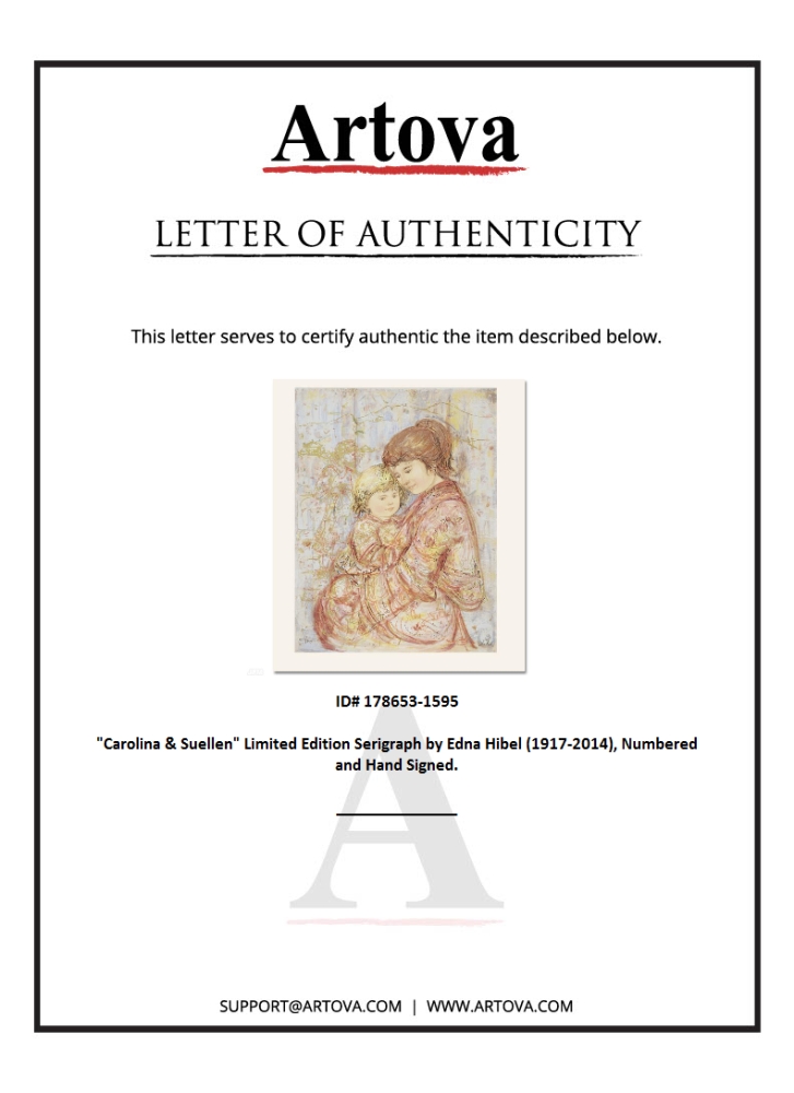 "Carolina & Suellen" is a limited edition lithograph on paper, numbered and hand signed by Edna Hibel (1917-2014). Includes Certificate of Authenticity. Measures approx. 15" x 20" (with border), 12" x 16" (image).