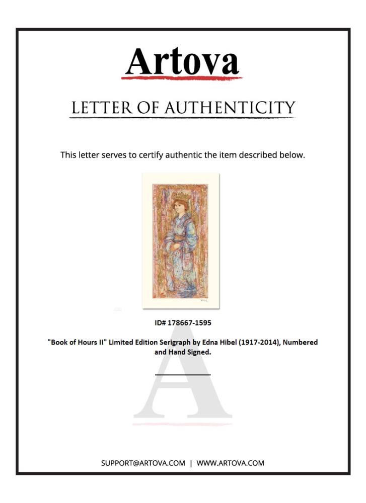 "Book of Hours II" is a limited edition serigraph on paper, numbered and hand signed by Edna Hibel (1917-2014). Includes Certificate of Authenticity! Measures approx. 11" x 19" (with border), 8" x 16" (image).