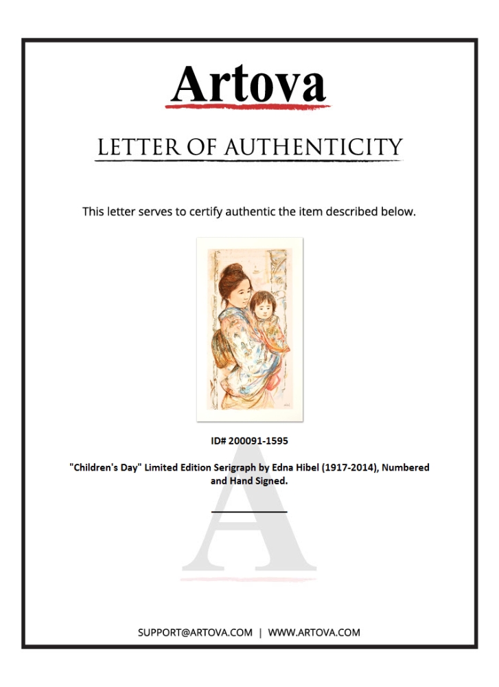 "Children's Day" is a limited edition serigraph on paper, numbered and hand-signed by Edna Hibel (1917-2014). Measures approximately 18" x 30" (with border), 14.5" x 26" (image).
