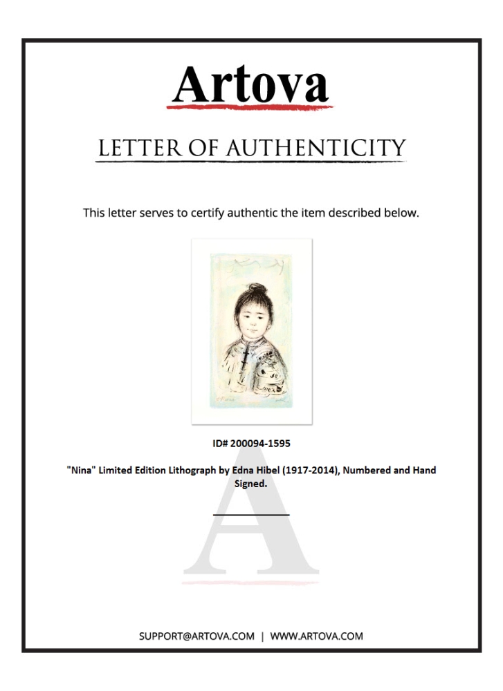 "Nina" is a limited edition lithograph on paper, numbered and hand signed by Edna Hibel (1917-2014). Includes Certificate of Authenticity! Measures approx. 12.5" x 20" (with border), 9" x 16.5" (image).
