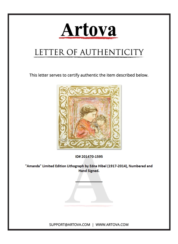 "Amanda" is a limited edition lithograph on paper, numbered and hand signed by Edna Hibel (1917-2014). Includes Certificate of Authenticity! Measures approx. 6" x 6" (no border).