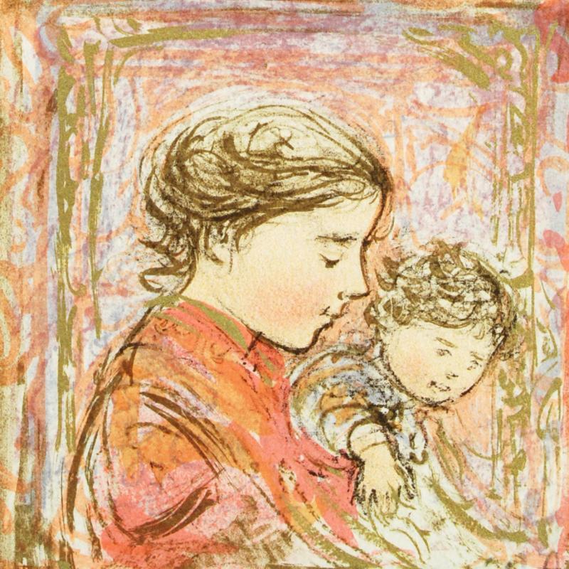 Edna Hibel (1917-2014) grew up in the Boston area and by the young age of 9, she began experimenting with painting in elementary school. Her summers were spent along the shore in Hull, Massachusetts, and in Maine learning about watercolor painting. Hibel received her formal artistic training at the Boston Museum School of Fine Arts, from 1935-1939. In 1942, she earned the Sturtevant Traveling Fellowship to Mexico.