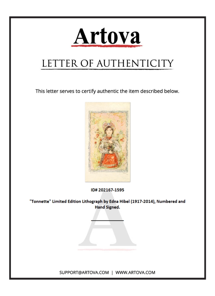 "Tonnette" is a limited edition lithograph on rice paper, numbered and hand signed by Edna Hibel (1917-2014). Includes Certificate of Authenticity! Measures approx. 13" x 22" (with border), 11" x 17" (image).