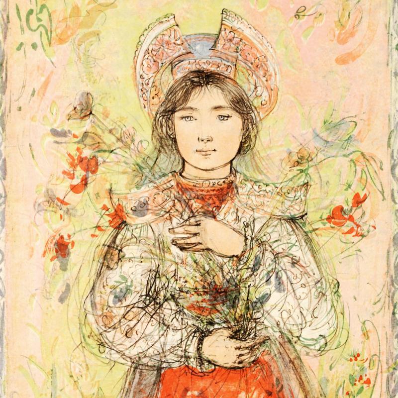 Edna Hibel (1917-2014) grew up in the Boston area and by the young age of 9, she began experimenting with painting in elementary school. Her summers where spent along the shore in Hull, Massachusetts and in Maine learning about watercolor painting. Hibel received her formal artistic training at the Boston Museum School of Fine Arts, from 1935-1939. In 1942, she earned the Sturtevant Traveling Fellowship to Mexico.