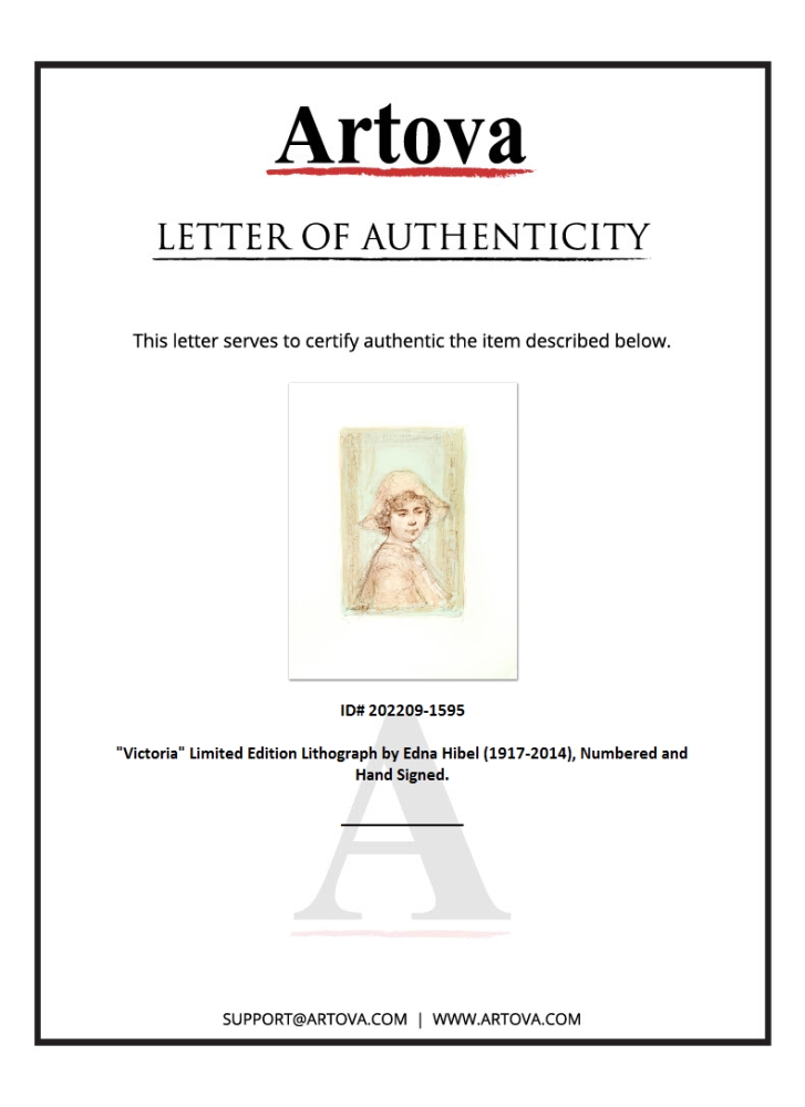 "Victoria" is a limited edition lithograph on paper, numbered and hand-signed by Edna Hibel (1917-2014). Measures approx. 19.5" x 25.5" (with border), 10.5" x 16" (image).