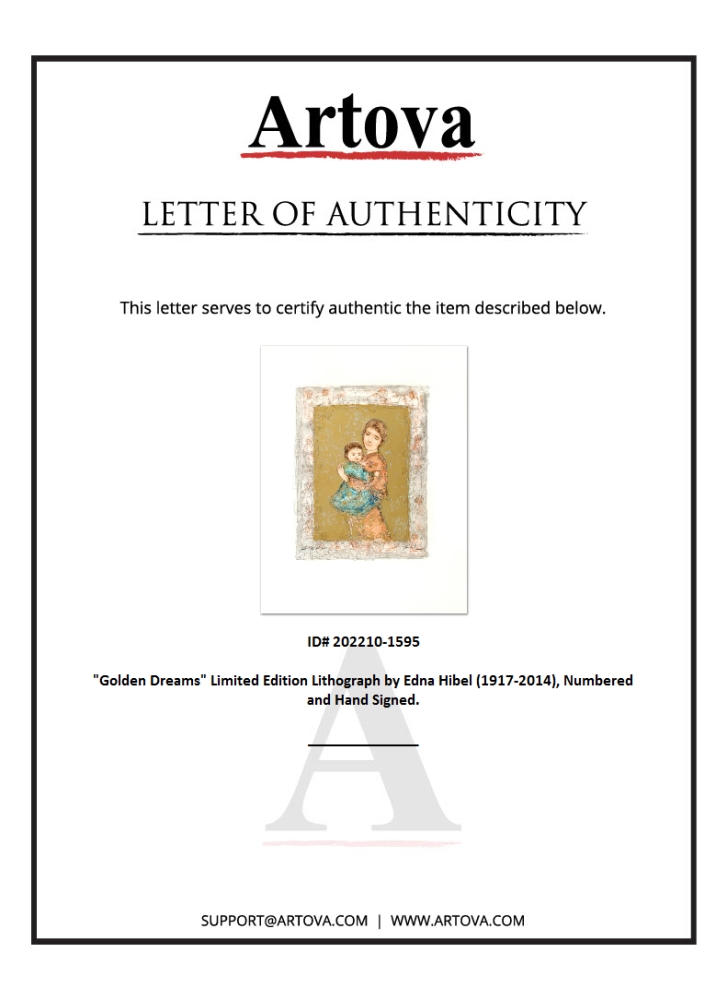 "Golden Dreams" is a limited edition lithograph on paper, numbered and hand signed by Edna Hibel (1917-2014). Includes Certificate of Authenticity! Measures approx. 21" x 26.5" (with border), 13.5" x 17" (image).