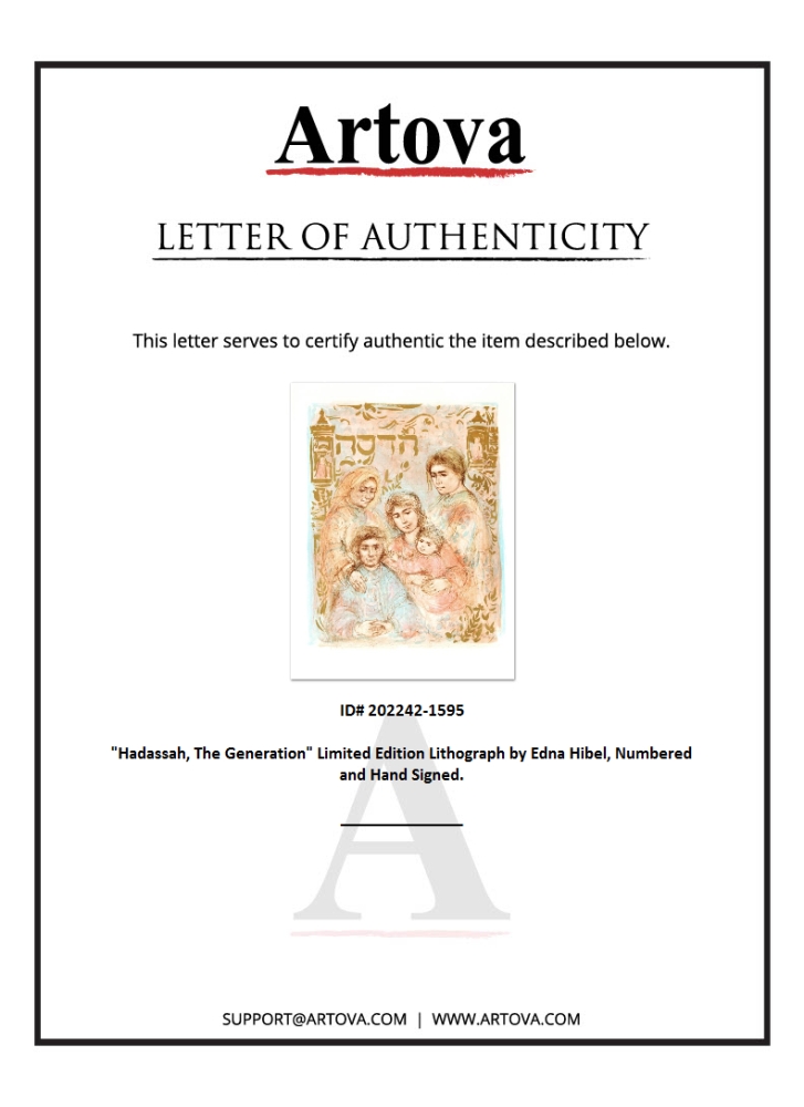 "Hadassah - The Generation" is a limited edition lithograph on paper, numbered and hand-signed by Edna Hibel. Includes Certificate of Authenticity! Measures approx. 20" x 25.5" (with border), 17" x 21" (image).