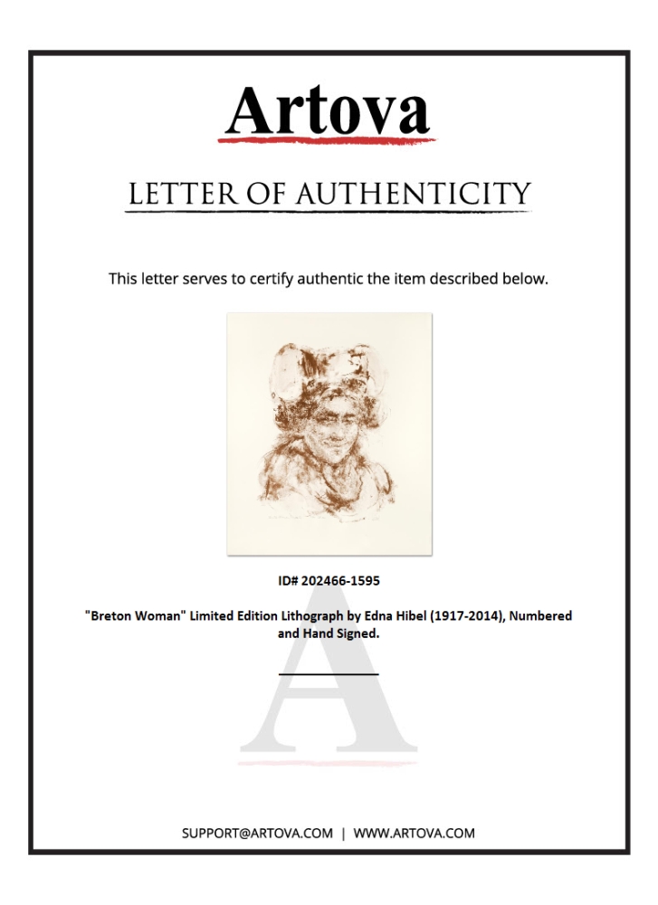 "Breton Woman" is a limited edition lithograph on paper, numbered and hand-signed by Edna Hibel (1917-2014). Includes Certificate of Authenticity! Measures approx. 24" x 28.5" (with border), 16.5" x 20.5" (image).