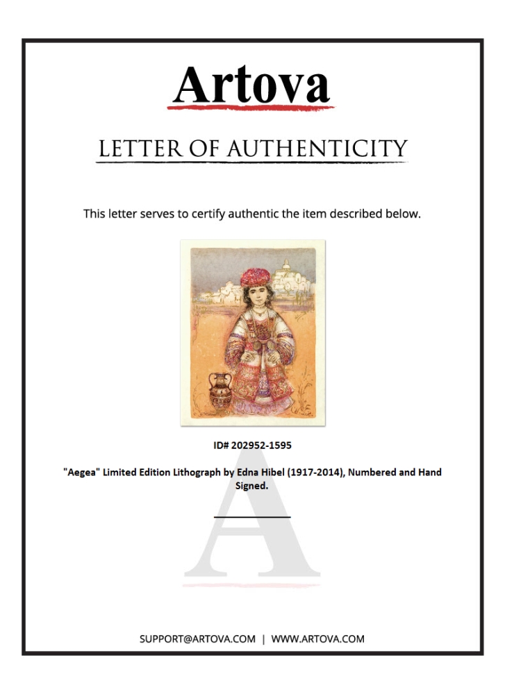 "Aegea" is a limited edition lithograph on rice paper, numbered and hand signed by Edna Hibel (1917-2014). Includes Certificate of Authenticity! Measures approx. 19.5" x 25.5" (with border), 17" x 23" (image).