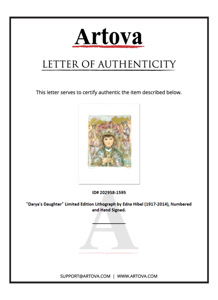 "Darya's Daughter" is a limited edition lithograph on paper, numbered and hand-signed by Edna Hibel (1917-2014). Measures approx. 20" x 26" (with border), 14" x 16.5" (image).