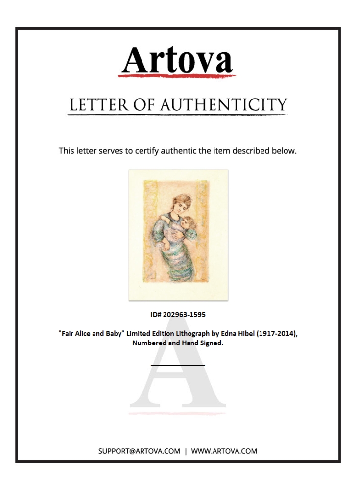"Fair Alice and Baby" is a limited edition lithograph on rice paper, numbered and hand-signed by Edna Hibel (1917-2014). Includes Certificate of Authenticity! Measures approx. 20" x 26.5" (with border), 13" x 21" (image).