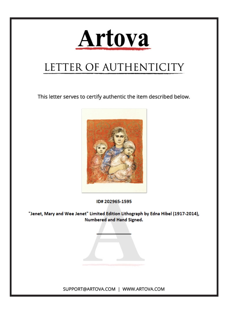 "Jenet, Mary and Wee Jenet" is a limited edition lithograph on rice paper, numbered and hand signed by Edna Hibel (1917-2014). Includes Certificate of Authenticity! Measures approx. 19.5" x 25.5" (with border), 16.5" x 19" (image).