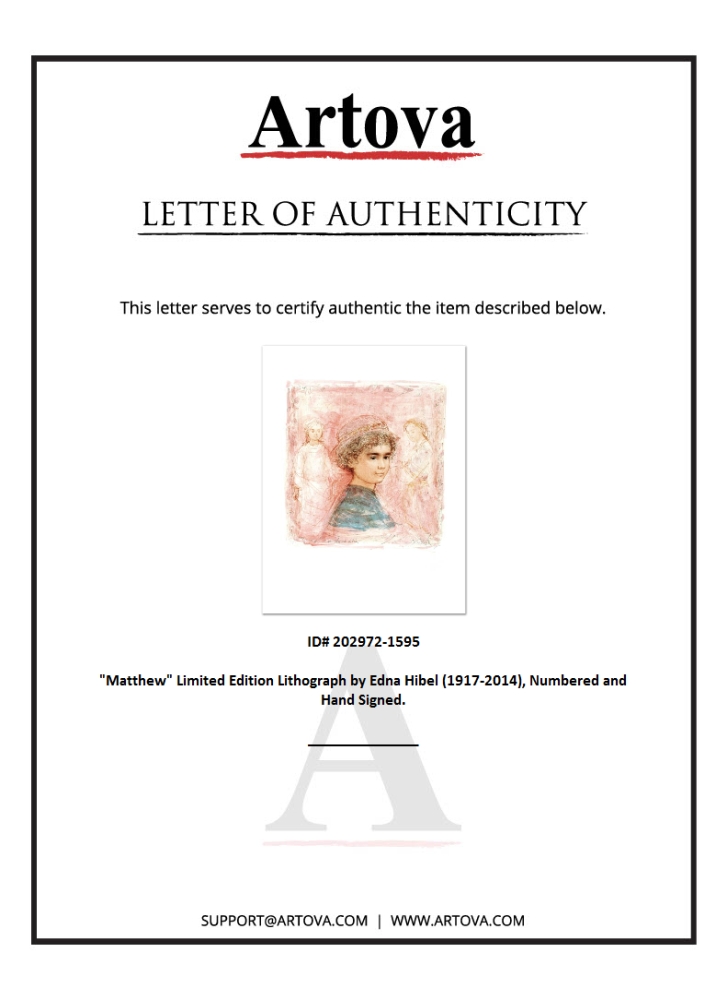 "Matthew" is a limited edition lithograph on paper, numbered and hand-signed by Edna Hibel (1917-2014). Includes Certificate of Authenticity! Measures approx. 20" x 25.5" (with border), 15" x 16" (image).
