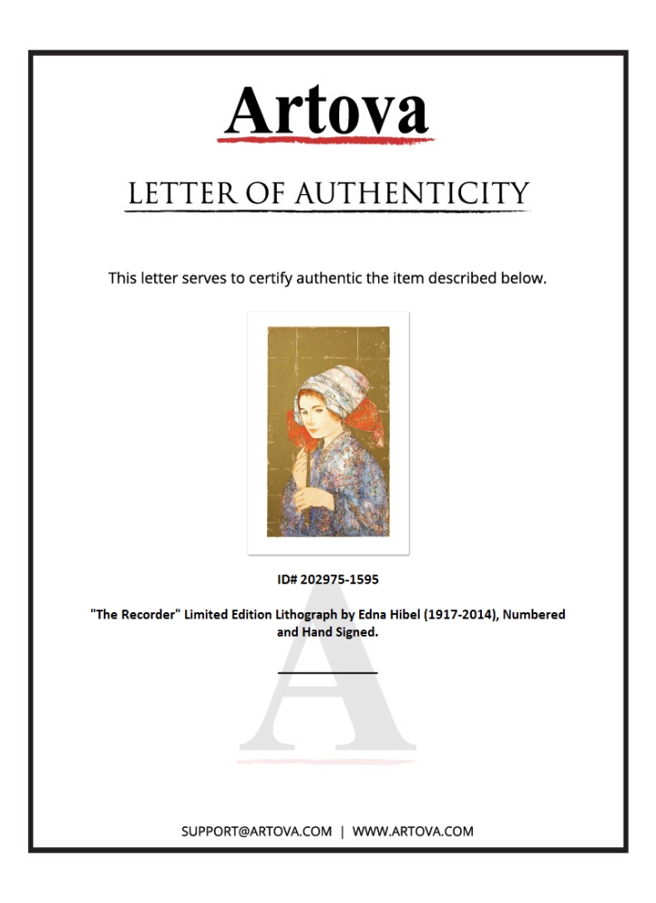 "The Recorder" is a limited edition lithograph on paper, numbered and hand signed by Edna Hibel (1917-2014). Includes Certificate of Authenticity! Measures approx. 20" x 30" (with border), 15" x 26" (image).