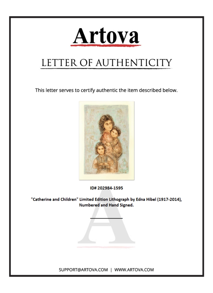 "Catherine and Children" is a limited edition lithograph on paper, numbered and hand-signed by Edna Hibel (1917-2014). Includes Certificate of Authenticity! Measures approx. 25" x 35.5" (with border), 20" x 31" (image).