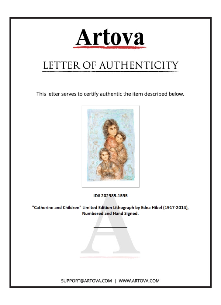 "Catherine and Children" is a limited edition lithograph on paper, numbered and hand-signed by Edna Hibel (1917-2014). Includes Certificate of Authenticity! Measures approx. 25" x 35.5" (with border), 20" x 31" (image).