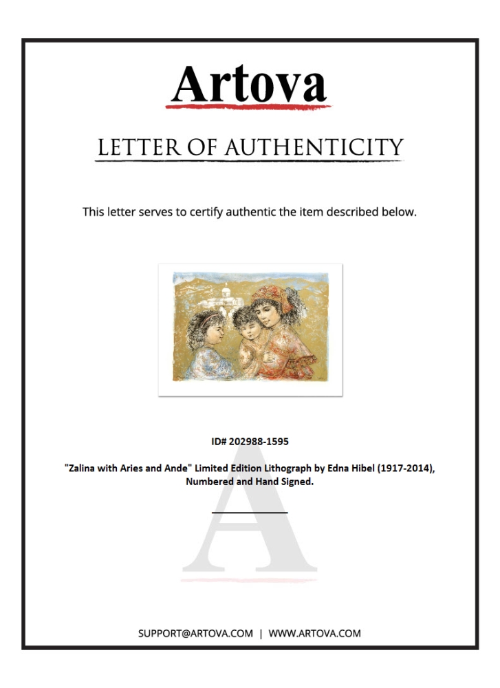 "Zalina with Aries and Ande" is a limited edition lithograph on paper, numbered and hand-signed by Edna Hibel (1917-2014). Includes Certificate of Authenticity! Measures approx. 35.5" x 25" (with border), 30" x 20" (image).