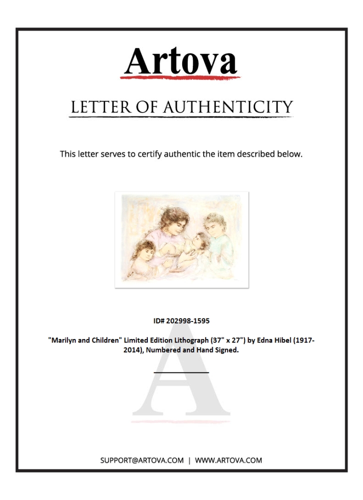 "Marilyn and Children" is a limited edition lithograph on paper, numbered and hand-signed by Edna Hibel (1917-2014). Includes Certificate of Authenticity! Measures approx. 41.5" x 30" (with border), 37" x 27" (image).