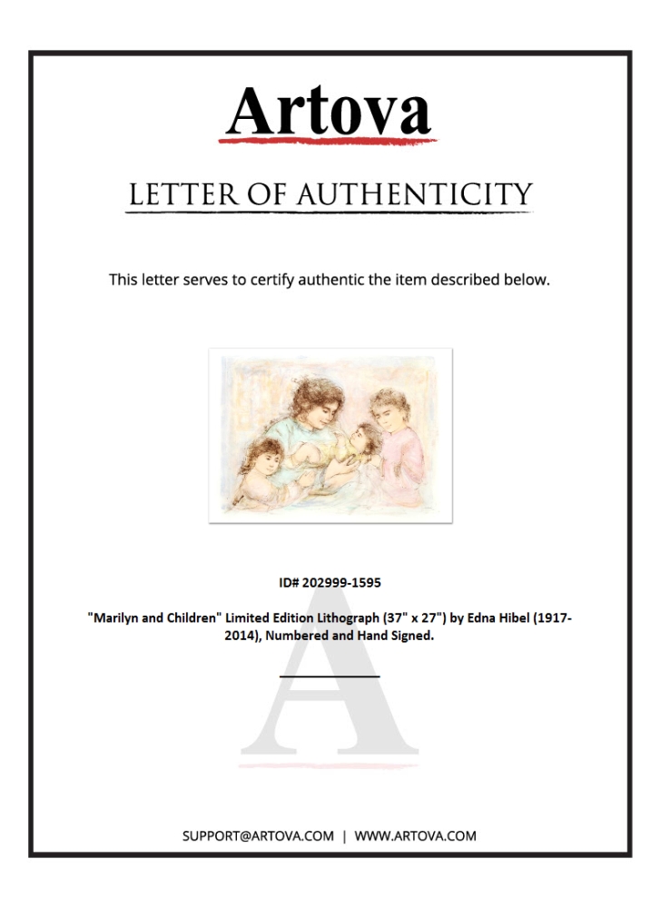 "Marilyn and Children" is a limited edition lithograph on paper, numbered and hand-signed by Edna Hibel (1917-2014). Includes Certificate of Authenticity! Measures approx. 41.5" x 30" (with border), 37" x 27" (image).