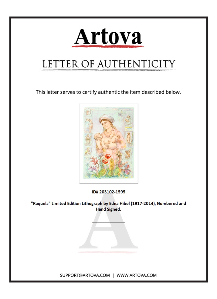 "Raquela" is a limited edition lithograph on paper, numbered and hand-signed by Edna Hibel (1917-2014). Includes Certificate of Authenticity! Measures approx. 27" x 37.5" (with border), 23" x 33" (image).