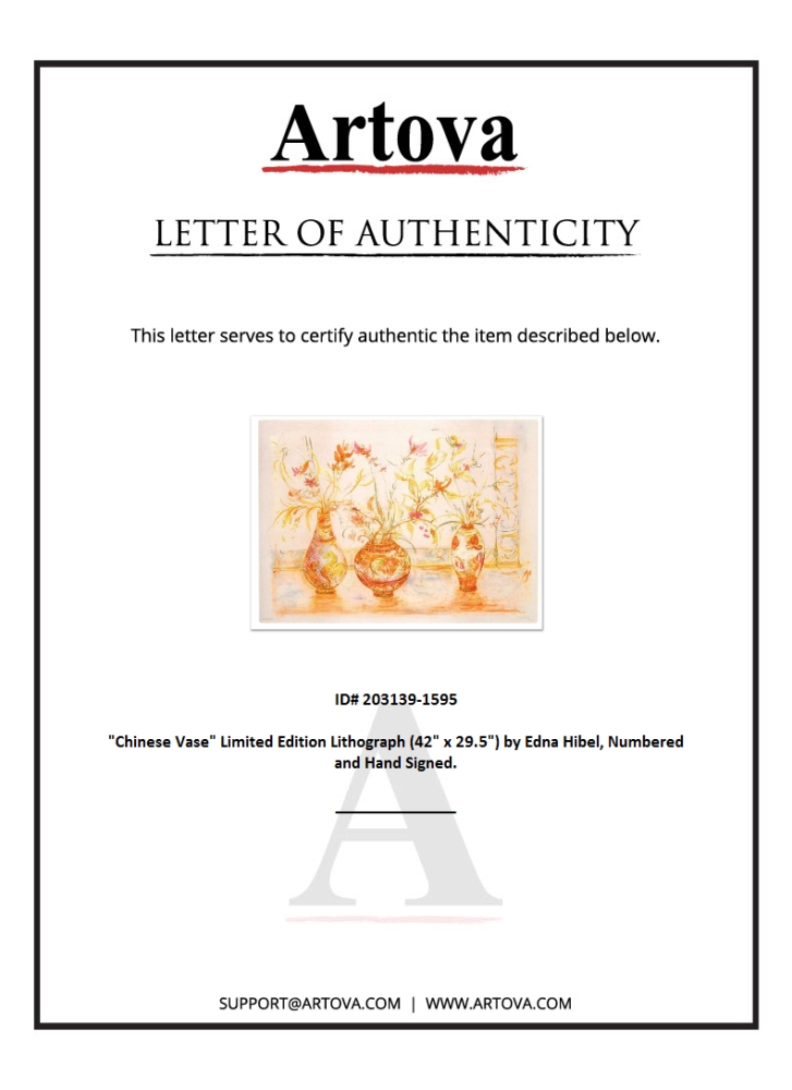 "Chinese Vase" is a limited edition lithograph on paper, numbered and hand-signed by Edna Hibel. Includes Certificate of Authenticity! Measures approx. 44" x 31" (with border), 42" x 29.5" (image).