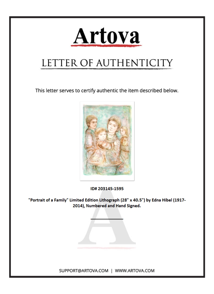 "Portrait of a Family" is a limited edition lithograph on paper, numbered and hand-signed by Edna Hibel (1917-2014). Includes Certificate of Authenticity! Measures approx. 31.5" x 44" (with border), 28" x 40.5" (image).