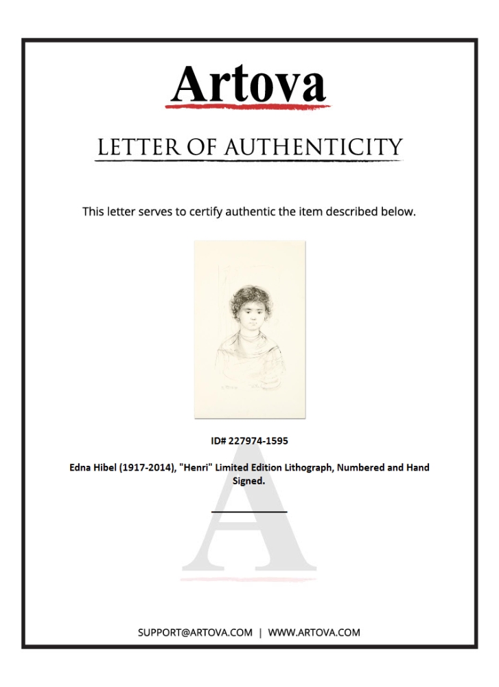 "Henri" is a limited edition lithograph on paper by Edna Hibel (1917-2014), numbered and hand-signed by the artist. Includes Certificate of Authenticity. Measures approx. 12.5" x 20" (border), 8.5" x 14.5" (image).